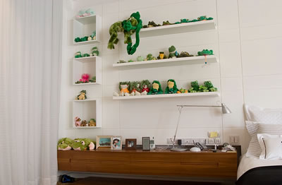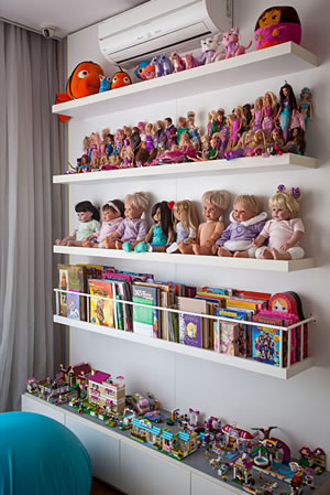 Quem é colecionador sempre tem o apreço de mostrar as peças e guardá-las com muito carinho. Em mais um dormitório infantil, as estruturas de madeira fixadas nas paredes foram eleitas para expor a coleção de bonecas, livros e outros brinquedos, contribuindo também para a organização do ambiente.