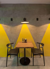 Cortes no papel de parede denotam uma maneira divertida de trazer o geometrismo e a interatividade aos ambientes. Nesse ambiente, o corte expõe a silhueta da luz de uma forma bem original.