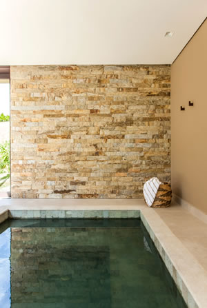 O destaque da piscina aquecida é o revestimento de pedra madeira na parede. Típica de Itu, no interior de São Paulo e onde está situado o projeto da residência, o material natural completou com tonalidade e textura a proposta rústica e relaxante do projeto.