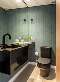 O lavabo recebeu tons escuros na bancada e na bacia sanitária e foi complementado pelo papel de parede verde musgo que reveste as paredes, entregando a sofisticação almejada na realização do projeto.