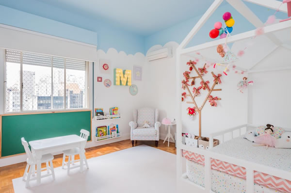 Para o décor do quarto infantil, elementos lúdicos, como a cama em forma de casinha, completa as nuvens pintadas nas paredes.