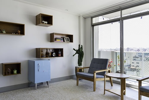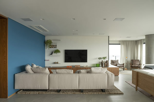Na sala de TV, a arquiteta Patricia Miranda adotou um rodapé com apenas 3 centímetros de largura. De acordo com a especialista, a intenção foi conceder uma apenas uma ‘linha’ e abrir espaço para destacar os revestimentos das paredes | Foto: Cacá Bratke Produção: Debbie Apsan