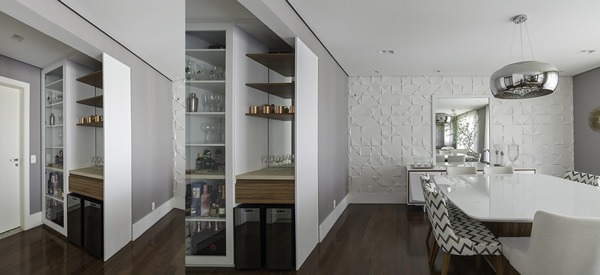 Em mais uma sala de jantar assinada pela arquiteta Patricia Miranda, o rodapé branco desempenha um papel de transição visual. Em MDF laqueado, o material criou um visual interessante com o piso de madeira, a parede cinza e a principal, com revestimentos 3D| Fotos: Edson Ferreira
