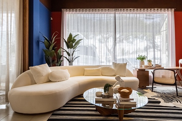 Ambiente projetado pelo arquiteto Anderson Leite, o sofá Morphos, em formato orgânico e muito aconchegante, feito pelo designer Everton Souza, que foi revestido com o tecido Stella, da Dino Zoli Brasil |Foto: Thais Oliveira