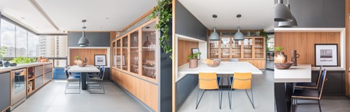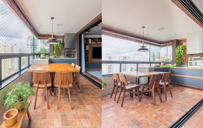 Com a felicidade de ter não apenas uma – mas sim duas varandas! –, ao lado da sala o casal tem à disposição a sua estrutura de varanda gourmet. No espaço, a bancada em ‘L’, complementada por uma marcenaria bem otimizada, recebe a distribuição que compreende a churrasqueira, a pia e uma área de suporte e manuseio dos alimentos. A percepção de um clima mais campestre é facilmente notada por meio do piso de cerâmico lepri e o estilo da mesa com as cadeiras. “No limite entre a área de varanda e o estar, permanecemos com a estrutura das portas de correr que designam aos moradores a decisão de mantê-la fechada ou aberta, como um convite à circulação”, explana o arquiteto Pietro Terlizzi.