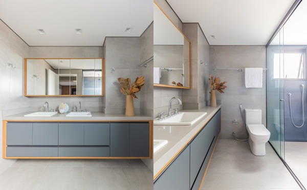 Com dimensões generosas, o banheiro do casal deixa evidente a atenção com o conforto: além das duas cubas embutidas dispostas na espaçosa bancada, o box piso-teto é um convite ao relaxamento e o bem-estar térmico, principalmente nos dias mais frios, uma vez que retém o vapor.