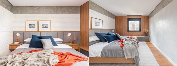 No dormitório do casal, Pietro trabalhou com a harmonia de elementos com suas características distintas: a marcenaria com o estofado da cabeceira e a parede em ‘L’ que mescla a estética do tijolinho branco e uma faixa superior com o visual de cimento queimado, com exceção do lado onde está a esquadria, que recebeu uma espécie de envelopamento de madeira, criando uma barreira extra contra o frio.