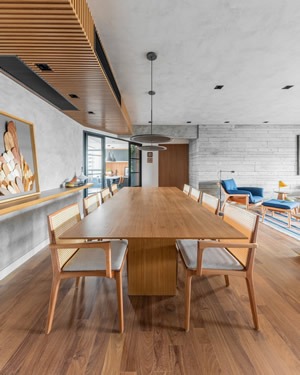 Na sala de jantar, o amadeirado leve dá o tom com a formatação do mobiliário. Ao protagonizar o ambiente, a generosa mesa de madeira é acompanhada por 8 cadeiras que ressaltam a naturalidade da palhinha empregada na confecção do encosto. Próxima à entrada, um banco de madeira - com nichos e baú para acomodar os sapatos -, e um gracioso painel com penduradores adornam o espaço que acolhe os itens pessoais dos moradores e seus visitantes.