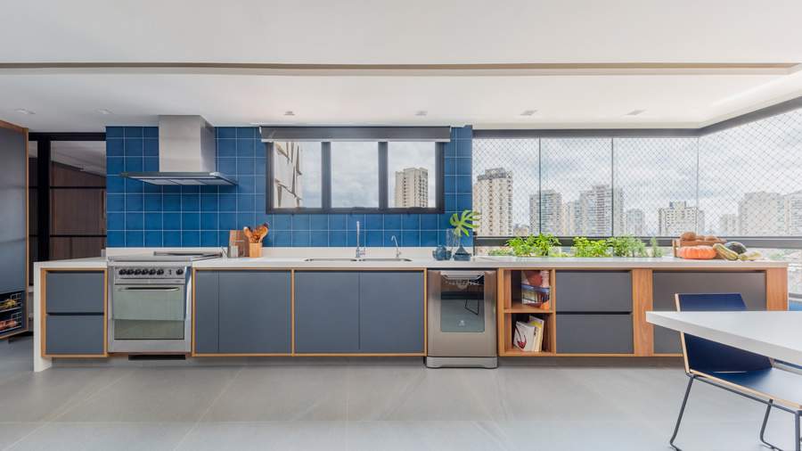 No projeto do arquiteto Pietro Terlizzi, a expansão da cozinha aconteceu pela área onde estava uma das varandas do apartamento. O envidraçamento enriquece o ambiente com a iluminação natural por todo o dia | Foto: Guilherme Pucci