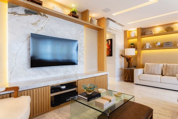 Elegante Painel de Mármore Matarazzo, caracterizado por seus veios sutis em tons acinzentados e dourados, emoldura com maestria a televisão na sala de estar| Projeto Etri Arquitetos | Foto: Leandro Furini