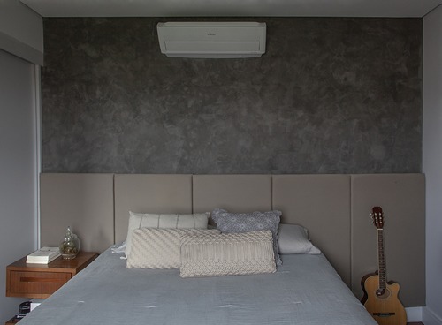 O uso de texturas, pinturas e papeis de parede é uma maneira muito prática para repaginar o quarto. A aplicação é fácil, mas é necessário saber que ao devolver o imóvel, esta parede deverá ser pintada novamente, e até mesmo lixada, dependendo do caso. Neste apartamento a arquiteta adotou a tinta Cimento Queimado da Suvinil na cor Concreto. Aplicada pelo próprio pintor, tivemos um resultado maravilhoso e que fez toda a diferença | Foto: Luis Gomes