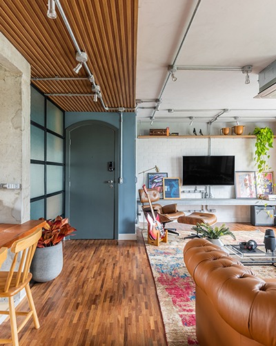 Neste apartamento, Pietro Terlizzi uniu o moderno e o industrial. Com as ripas de freijó no forro, criou-se um corredor que dá as boas-vindas. A madeira não escondeu os eletrodutos, mas serviu de contraste entre os materiais| Foto: Guilherme Pucci