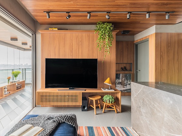 Nesta sala de estar, o arquiteto Pietro Terlizzi adotou o cumaru no forro, mas na marcenaria e nos painéis há o freijó. Sim, é possível misturar diferentes tipos de espécies e conquistar um resultado lindo. Veja que a madeira compõe um contraste importante com o piso de porcelanato com visual de concreto e a bancada de mármore Gris Armani | Foto: Guilherme Pucci