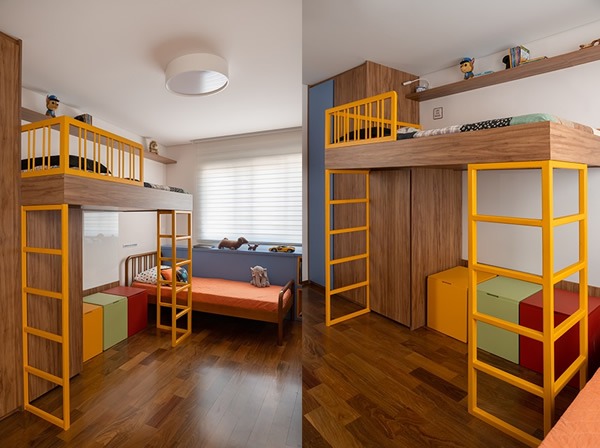 Um ambiente cheio de combinações e cores projetado pela arquiteta Patricia Miranda. Com um belo projeto de marcenaria, um beliche foi incluído neste dormitório. Os bancos coloridos e com tampas oferecem também a finalidade de receber os brinquedos | Fotos: Cacá Bratke