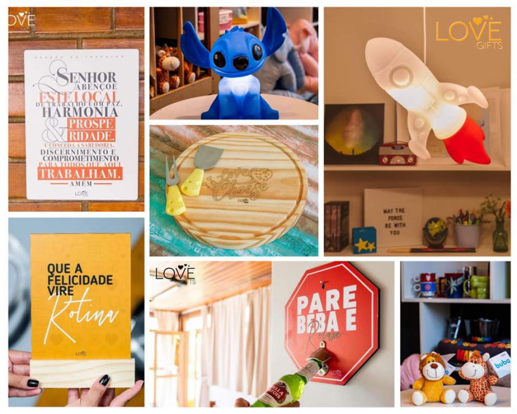 Na Love Gifts – rede de franquias especializada em presentes e decorações criativas, existem diversas opções de objetos para a decoração tais como: luminárias, quadros, porta-objetos, placas divertidas, canecas, almofadas, pelúcias de diversos personagens e muitos outros.