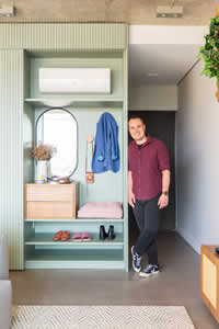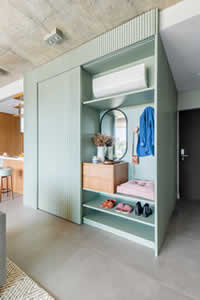 Na entrada do apartamento, a marcenaria verde menta – escolha do arquiteto Bruno Moraes para a marcenaria que abriga a chapeleira que acomoda os itens dos moradores e visitantes –, adorna com simpatia a aura do cimento queimado do piso de porcelanato e a laje aparente de concreto | Foto: Guilherme Pucci