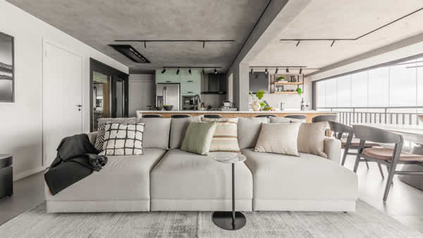 Com a integração de sala de estar, cozinha e varanda, os moradores podem conversar uns com os outros de qualquer ponto, pois não existe segregação alguma que atrapalhe a comunicação deles| Foto: Guilherme Pucci