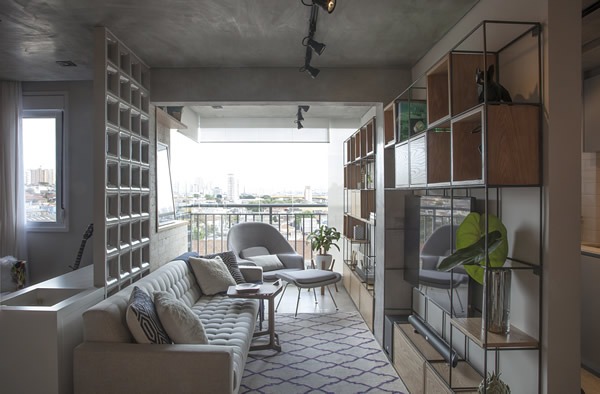 Com grande parte da área social integrada, o conceito industrial marca os ambientes e os une. No estar, a serralheria no móvel da TV, cimento queimado no piso e teto, e spots fixados no teto acolhem quem estiver por ali. | Foto: Luis Gomes