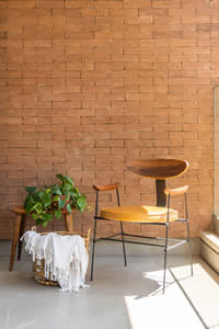 Um mix equilibrado nesse cantinho da varanda: o décor realizado pelo arquiteto Bruno Moraes exalta os tons terrosos dos tijolinhos, a madeira dos móveis e a delicadeza do cesto de palha. A adição das plantas deixou o espaço inspirado pela essência do natural | Foto: Guilherme Pucci