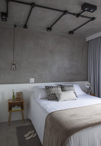 O cinza é tom predominante deste quarto de casal realizado pelo arquiteto Bruno Moraes: parede e teto foram pintadas com tinta que imita cimento queimado e, no piso, o porcelanato acompanha o mesmo visual. Executada em linho cinza, a cortina entrou em cena para criar uma clima afetuoso | Foto: Luis Gomes