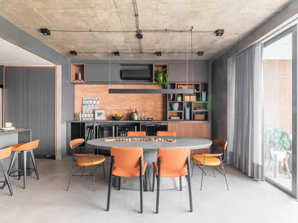 Com a predominância dos nuances de cinza, o arquiteto explica que os tons terrosos, comumente evidenciado nos tijolinhos, são sempre boas apostas para entregar um mix de cores dentro de uma proposta aconchegante. Nas possibilidades, ele também destaca que, quando bem dosado, cores vivas como verde, laranja, azul e as variações da cartela pastel resultam em composições super harmoniosas.