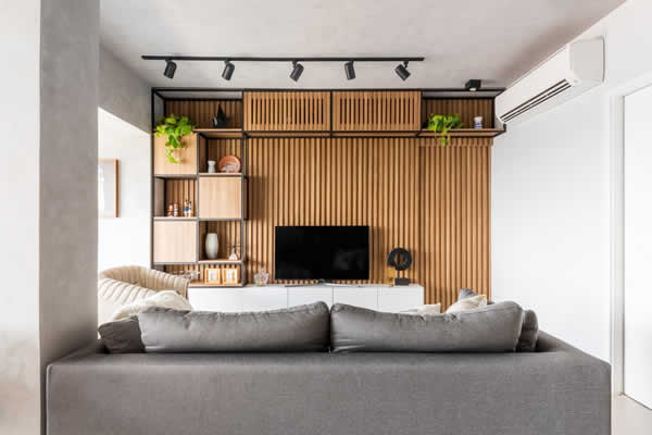Levando em consideração o estilo dos moradores e as demandas inerentes ao ambiente, o projeto de iluminação dessa sala de estar é marcado pelos trilhos direcionáveis com spots. Os nuances de cinza são atenuados pelo amadeirado leve e ripado que chama atenção na estante com nichos e estrutura de serralheria projetada pelo arquiteto Bruno Moraes| Foto: Guilherme Pucci