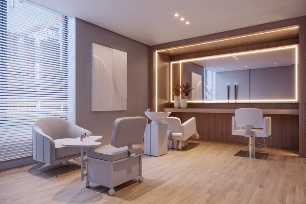 Garantindo a beleza e saúde interior, as novas soluções incorporadas aos condomínios também prevêem espaços destinados à estética, beleza e saúde mental, como os espaços wellness com beauty care. Projetados para funcionar como verdadeiros salões de beleza, esses espaços são especialmente idealizados para atender às demandas dos moradores com conforto e praticidade. “Projetamos o espaço wellness com todos os equipamentos de um SPA ou salão: cadeiras, estações de beleza bem iluminadas com espelhos, secadores de cabelo, lavatórios, cadeiras de manicure etc.”, complementa.