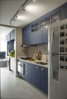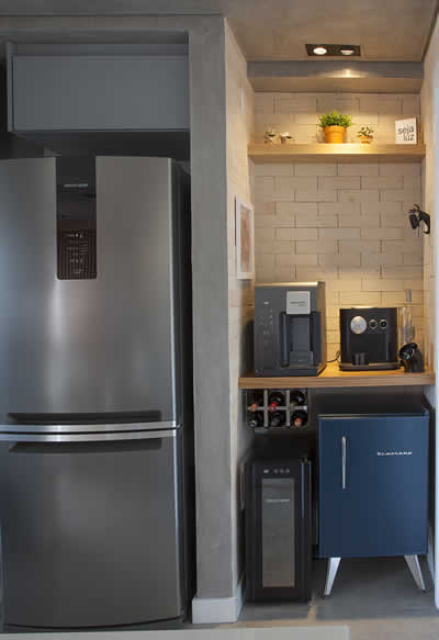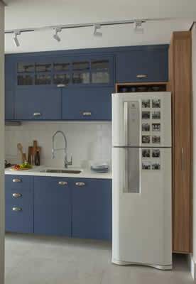 Entre as inúmeras possibilidades de utilização de cores em cozinhas, concentrar o colorido em eletrodomésticos também é uma dica de ouro. Nessa cozinha produzida pelo arquiteto Bruno Moraes, o frigobar azul foi o grande responsável por trazer vivacidade ao ambiente | Projeto BMA Studio | Foto: Luis Gomes