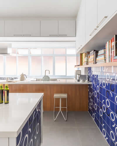 Na década de 1970, o colorido era intenso e presente tanto na marcenaria, revestimentos e eletrodomésticos. Hoje, sua presença é realizada sob medida e zelando pelo equilíbrio, conforme essa cozinha realizada pelo arquiteto Bruno Moraes. Com a predominância do branco na bancada e na marcenaria dos armários, a cerâmica azul, com detalhes em branco e preto, introduziu uma nova identidade na arquitetura de interiores | Projeto BMA Studio| Foto: Guilherme Pucci