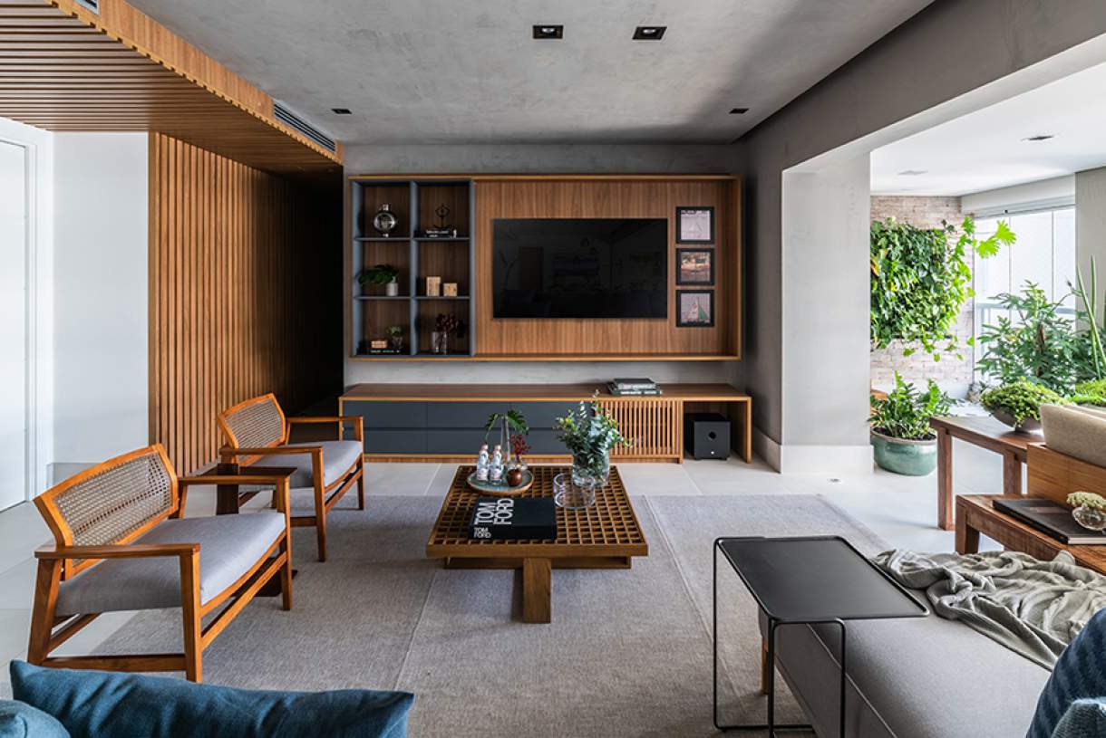 De modo geral, Pietro explica que o cimento queimado é um acabamento caracterizado pela aparência, à primeira vista, imperfeita e texturizada que remete ao concreto exposto após ser polido e tratado. Nos projetos, pode estar presente em ambientes internos de residências, escritórios, lojas e restaurantes, sempre com o intuito de atribuir um apelo moderno e versatilidade. “O bacana é a sintonia que a madeira, como o Freijó e outras variações, entrega uma belíssima dualidade, como o Yin-yang entre o quente e o frio. Sem dúvidas, enriquece muito os projetos”, analisa.