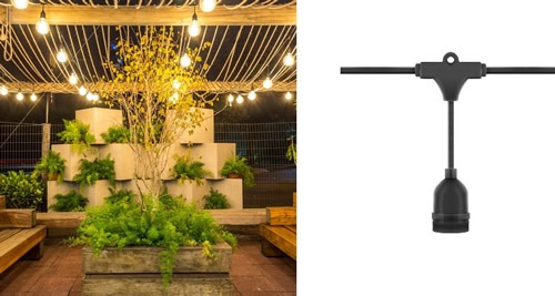 Cordão que comporta oito lâmpadas de soquete E27 (60W) e totalmente vedado em suas conexões. Possui índice de proteção IP65. Por ser resistente às ações do tempo, é próprio para uso em ambientes externos. Materiais: termoplástico e borracha. Valor – R$ 252 / Imagens: Divulgação Stella