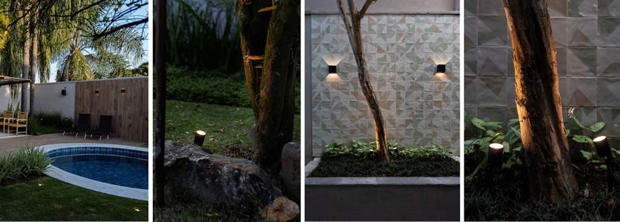 Áreas externas iluminadas com diferentes artigos / Projeto da arquiteta Luciana Ballio e fotos de Emerson Rodrigues