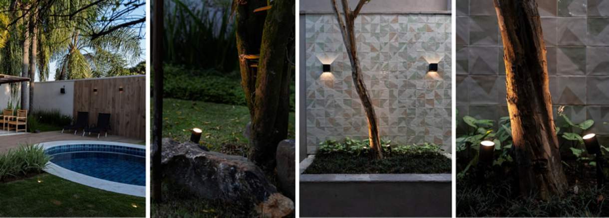 - A Uplighting, por exemplo, é quando a luz vem de baixo para cima. Esse método consiste na distribuição dos pontos de luz no nível do solo (com o uso de embutidos, espetos e/ou refletores), direcionando-os para as copas das árvores.