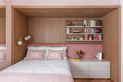 Os pórticos também são ótimas respostas quando o desafio é readequar um questão de obra civil. Ao movimentar a parede que dividia dois dormitórios desse apartamento, a viga tornou-se o x da questão que formou esse ‘U’ que envolve a cabeceira e a cama da moradora. Para concluir, o acabamento ripado deixou o décor de interior muito mais aconchegante.