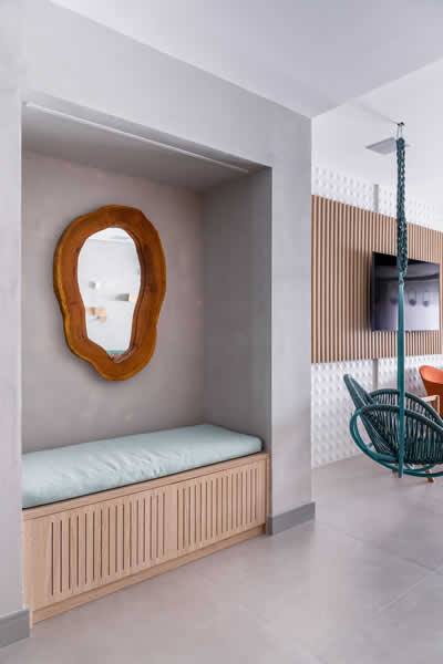 Na entrada desse apartamento executado pela arquiteta Cristiane Schiavoni no Guarujá, litoral de São Paulo, um grande pilar estava ‘perdido na sala’ e, aproveitando-se do fato de estar logo na entrada do imóvel, a construção do pórtico, em drywall, permitiu esconder a estrutura existente e, ainda por cima, se tornar o cantinho propício para tirar e calçar os sapatos. “Além de ‘abraçar’ quem usufrui o espaço, o banco cumpre a função de guardar os calçados”, detalha. Para arrematar, o espelho em formato orgânico complementa com simetria e a possibilidade de checar o visual ao chegar ou sair.
