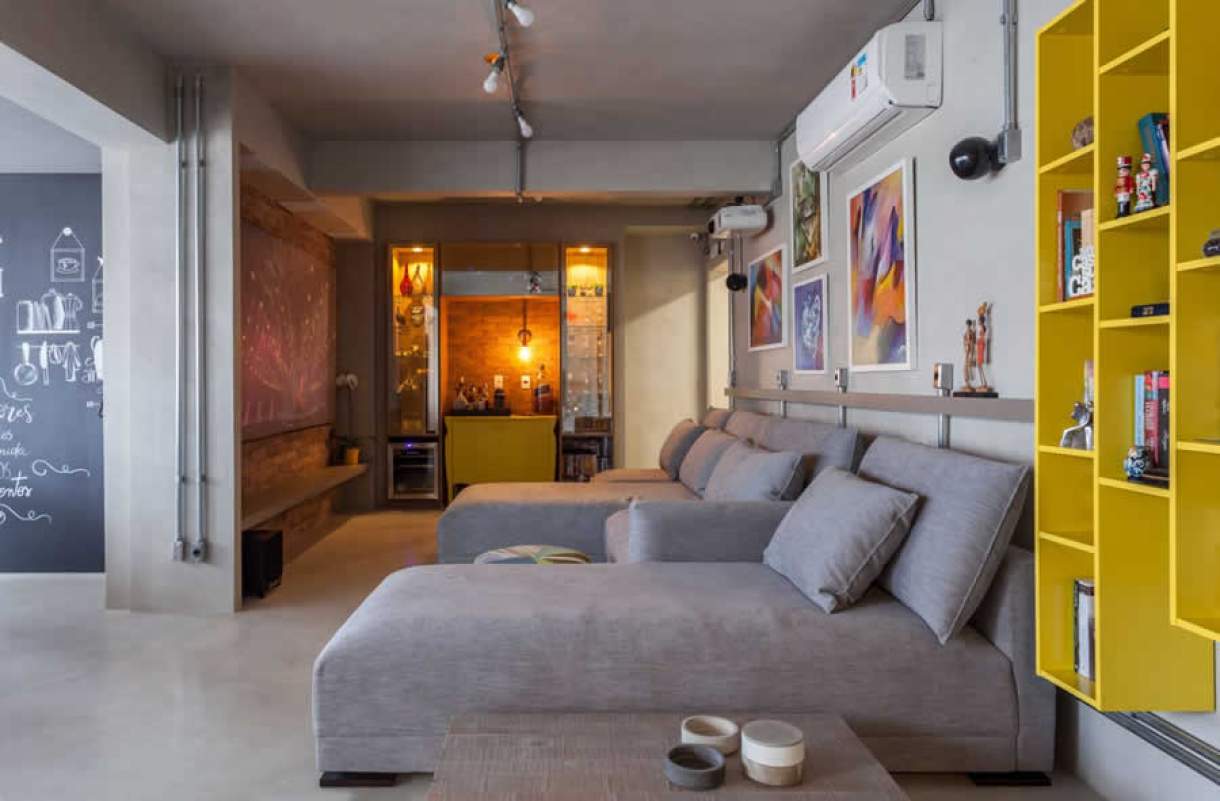 Nesse apartamento com estética industrial, no espaço do bar havia instalações hidráulicas que antes da reforma eram preservadas por uma sanca. No seu olhar inteligente, a arquiteta Cristiane Schiavoni encontrou no pórtico a melhor maneira para preservar o que não deveria ser visualizado e, ao mesmo tempo, entregou um bar completo, com direito à cristaleiras para acomodar copos e taças | Carlos Piratininga