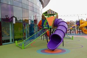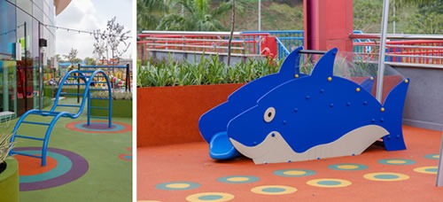 No entorno do brinquedo, todo o piso é do tipo EPDM colorido e moldado in loco especificamente para playgrounds | Quintalzinho do Ban - Projeto executivo da Effect Arquitetura e conceito desenvolvido pela VM Office junto à Ancar Ivanhoe Shoppings Centers | Foto: Divulgação