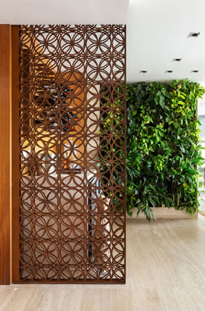 Biombos de materiais sustentáveis são uma alternativa para dentro de casa, criando destaque e separando sutilmente os ambientes | Projeto da Dantas & Passos Arquitetura | Foto: Maura Mello