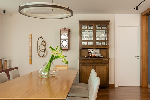 Nesta sala de jantar idealizada pela arquiteta Patricia Miranda, o ambiente revela a memória afetiva dos moradores com a cristaleira e o relógio de parede, que representam heranças de família | Foto: Caca Bratke