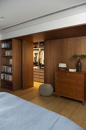 Neste dormitório a arquiteta Patricia Miranda, a marcenaria contemporânea desenhou a estante e o closet. No contraponto, a cômoda com puxador colonial trouxe um ‘que’ romântico ao décor | Foto: Caca Bratke