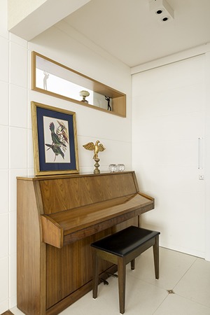 No cantinho deste apartamento projetado pela arquiteta Carina Dal Fabbro, o protagonista é, sem dúvida, o piano do morador. O décor ainda ganhou itens decorativos para completar o ambiente | Foto: Bruno Cardi