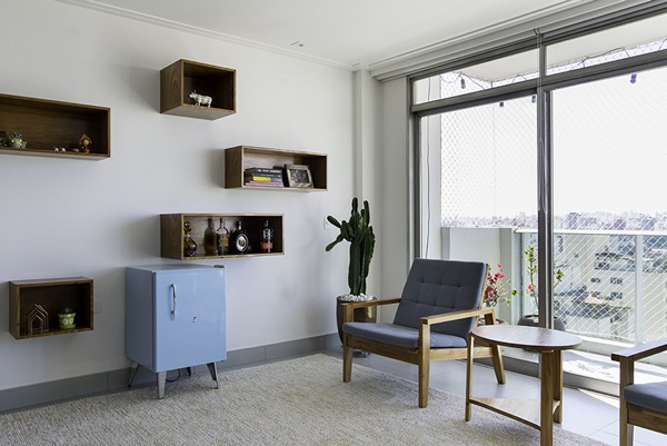 Neste living, a arquiteta Patricia Miranda resgatou a lembrança vintage com um frigobar azul, estilo que representou um marco nos refrigeradores da década de 1950 | Foto: Edson Ferreira