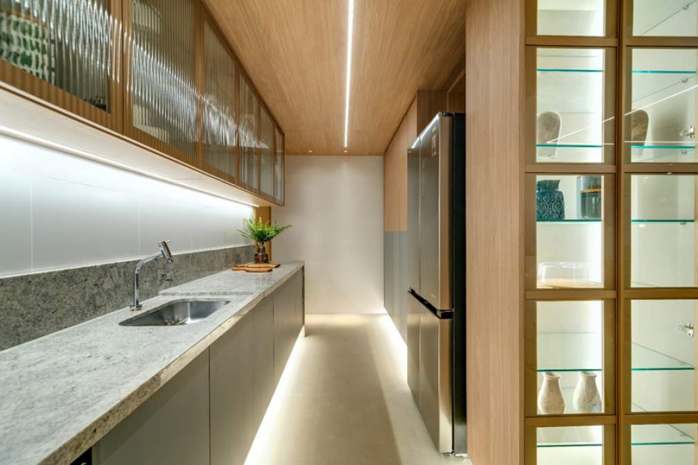 Dentro deste conceito, William apresenta na cozinha do decorado do Parque Noronha armários que trazem transparência e exercem a função de cristaleira. “Utilizei bastante a camuflagem neste projeto. A cristaleira, por exemplo, ganhou mais protagonismo, com o uso de uma iluminação interna para dar um destaque nesta peça”, conta.