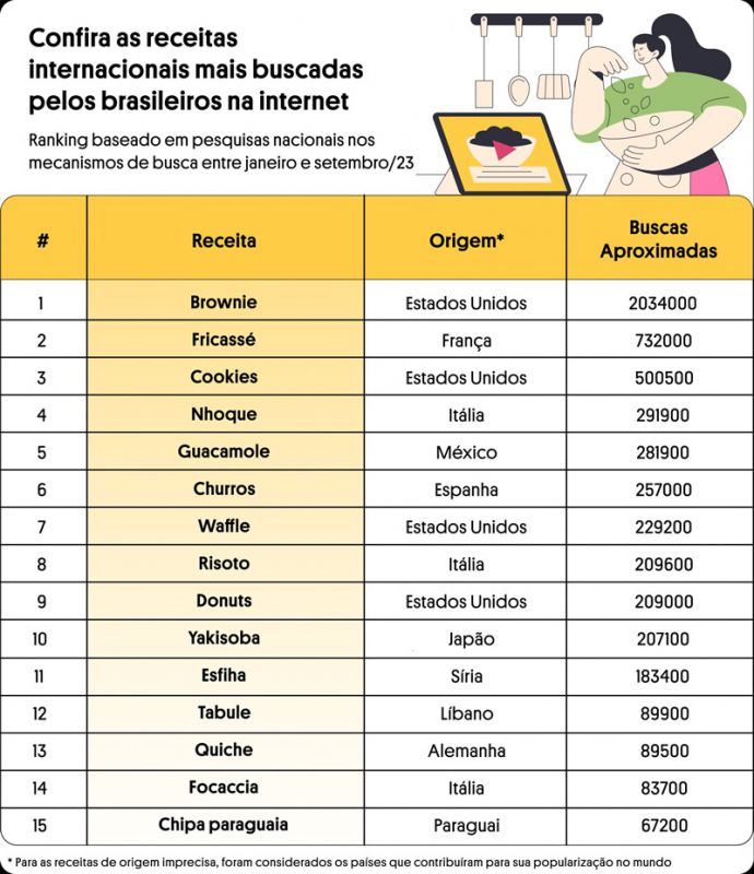 Para desvendar as receitas gringas mais buscadas em 2023, a pesquisa da Preply teve como ponto de partida os termos em ascensão relacionados ao tema na ferramenta Google Ads, cujo período de análise abarcou pesquisas realizadas entre janeiro e setembro deste ano nos mecanismos de buscas (intervalo mais recente disponibilizado). Compreendidos os alimentos de maior relevância, uma segunda análise girou em torno da quantidade total de buscas de cada receita no período — o que possibilitou a criação de um ranking com base no comportamento digital dos brasileiros nos últimos meses.