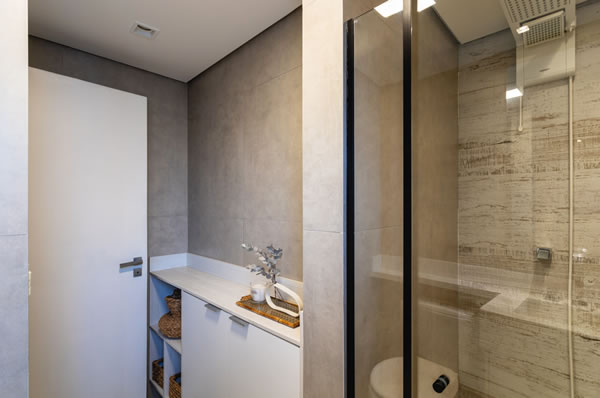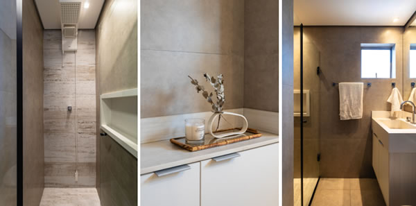 Espaçosa, a área do box recebeu um nicho embutido para os produtos de higiene | Projeto da Etri Arquitetos | Foto: Divulgação
