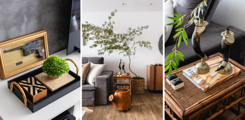 Atraentes detalhes da área social: objetos herdados de família como mesa lateral de bambu, a própria árvore de Bambu Mossô e uma lareira ecológica em formato de tora | Projeto da Etri Arquitetos | Foto: Divulgação