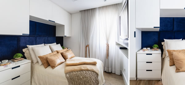 Com a base suave da paleta, o azul da cabeceira teve seus contornos marcados com a marcenaria dos armários aéreos. | Projeto da Etri Arquitetos | Foto: Divulgação