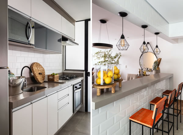 “O cinza foi considerado para promover um certo contraste entre o revestimento da cozinha e a marcenaria branca. Para o toque amadeirado, inserimos três banquetas rústicas para não descaracterizar o apartamento, assim como as portas de vidro do perfil preto”, recordam-se.