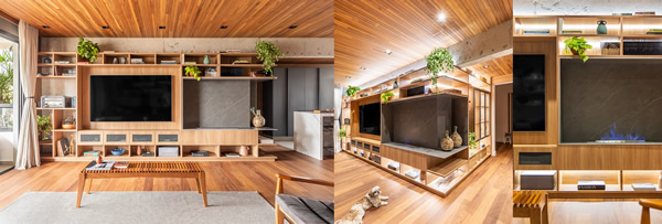 A estante da TV de madeira Mandorla (SCA Jardim Europa) foi a protagonista do home theater idealizado por Pietro Terlizzi. Com um charme especial, foi executada sob medida e conta com um nicho de neolith cinza onde foi instalada uma lareira de fluído | Fotos: Guilherme Pucci