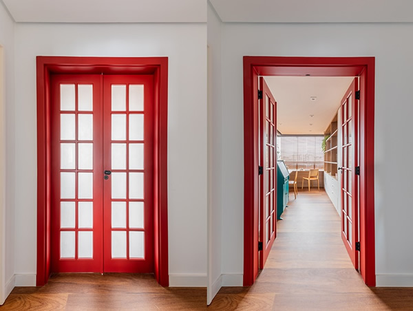 A vibrante porta vermelha e estilo inglesa, projetada pelo arquiteto Pietro Terlizzi, dá acesso ao home-office | Fotos: Guilherme Pucci